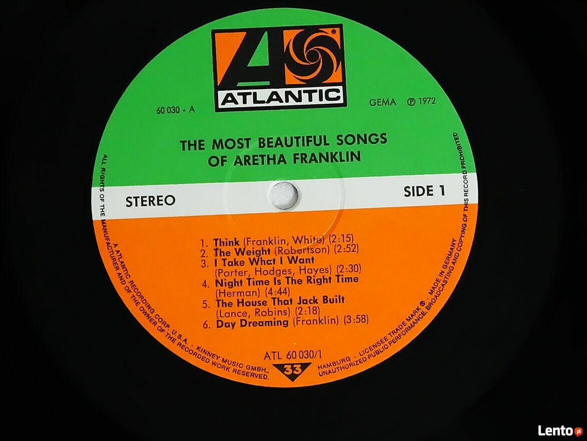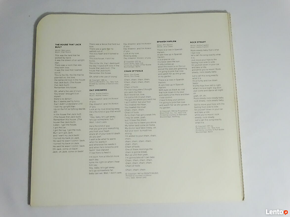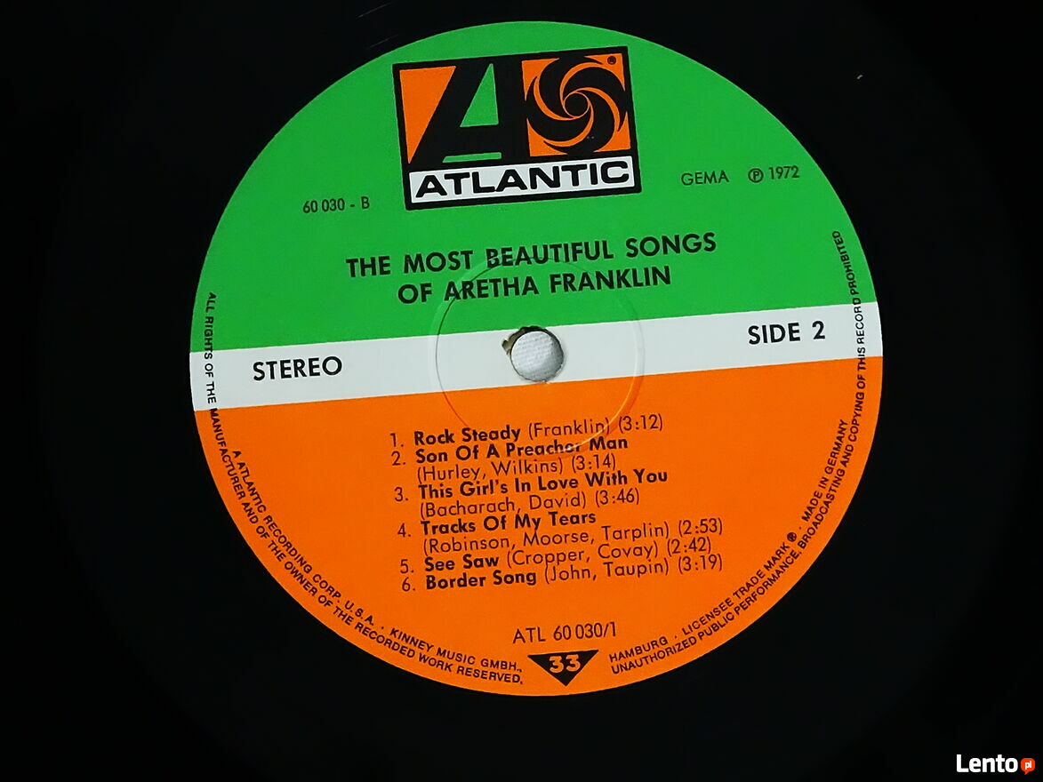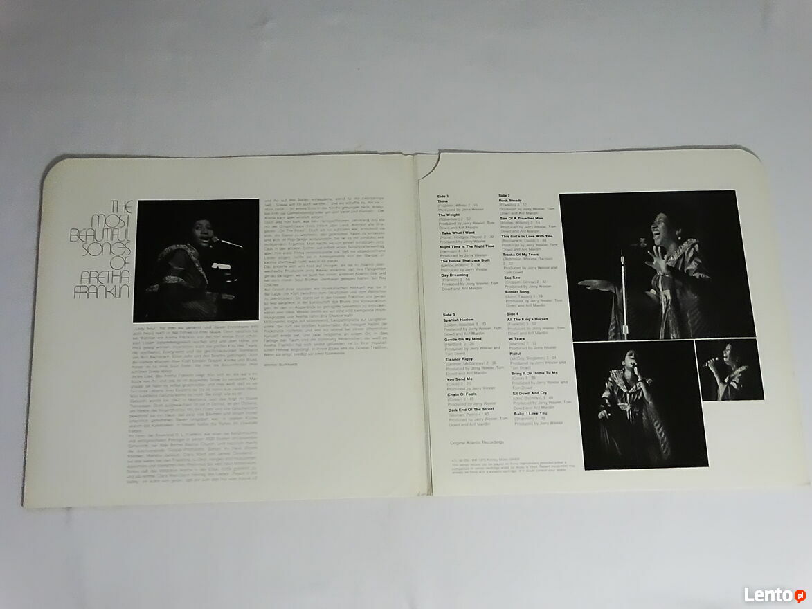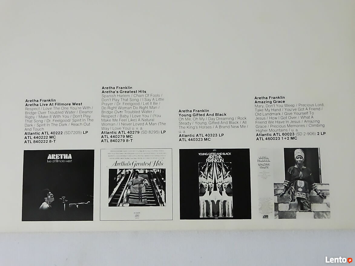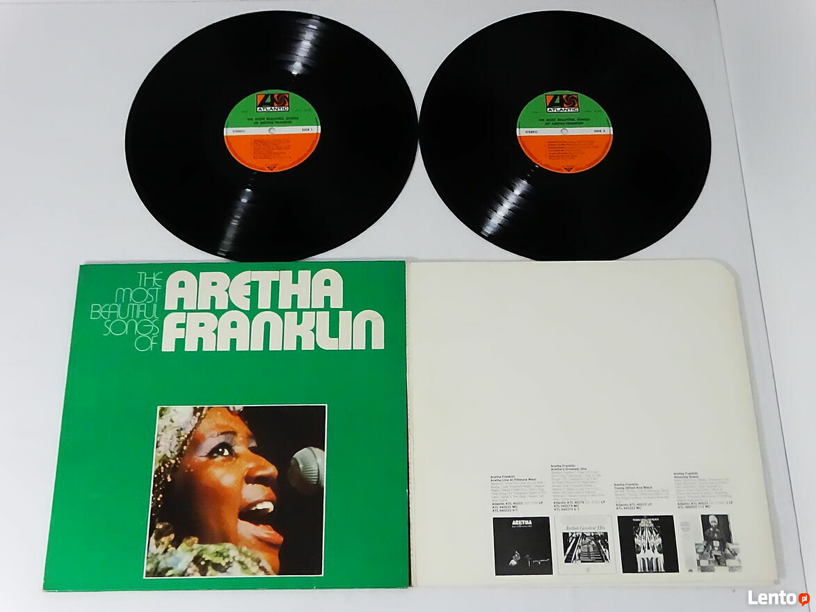 Aretha Franklin – The Most Beautiful Songs Of Aretha Franklin 2 x LP Winyl 1972 rok.Album dwupłytowy używany oryginalny z 1972 roku nie jakiś tam remaster czy reedycja. Obie płyty w bardzo dobrym stanie okładka w dobrym plus zwarzywszy na swój wiek. Zapraszam do sprawdzenia obejrzenia odsłuchu i oczywiście zakupu na miejscu u sprzedającego - zapraszam. Możliwa wysyłka - nie wysyłam za pobraniem. Płatność Blikiem na telefon za płytę + przesyłka jak najbardziej polecam - szybko i bezpiecznie. Zapraszam również na inne moje ogłoszenie na których mam wiele innych ciekawych płyt winylowych i nie tylko.