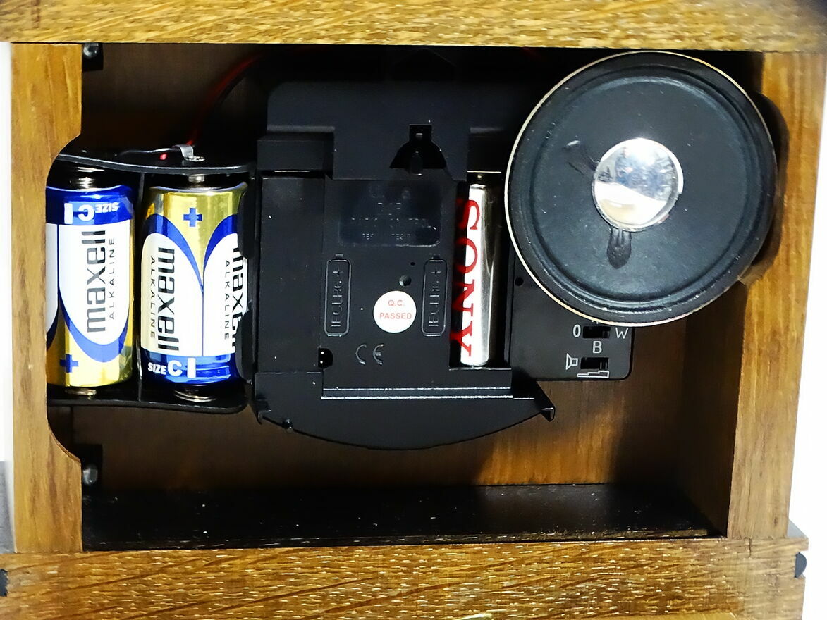 Wnętrze zawiera moduł elektroniczny, głośnik, przełącznik trybów (B/W/L) oraz zasilanie z baterii AA i C — co wskazuje na funkcje dźwiękowe (np. alarm, sygnał czasu, gong, bicie)