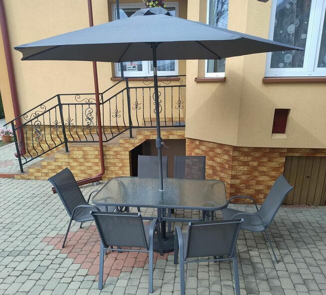 Sprzedam komplet ogrodowy: stół z parasolem oraz 6 krzeseł. Stan sprzętu idealny. Komplet zakupiona w 2025r .Sprzedaję ...