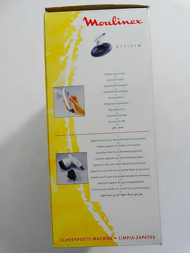 Urządzenie to Moulinex Citizen AEB2 – elektryczna polerka do butów, znana również jako shoe shiner lub schuhputzmaschine. To klasyczny przykład praktycznego designu z lat 80., który łączy wygodę z elegancją.