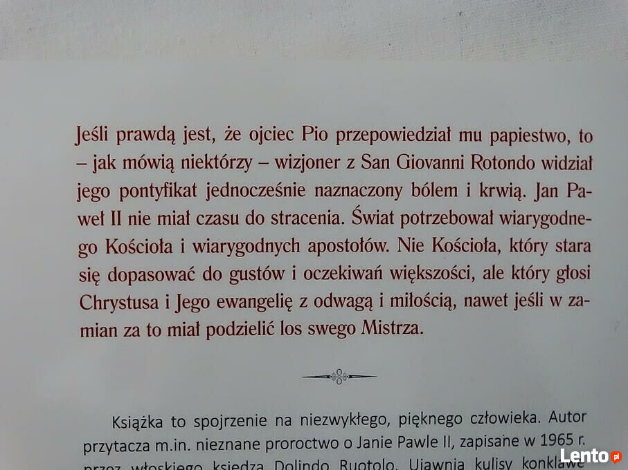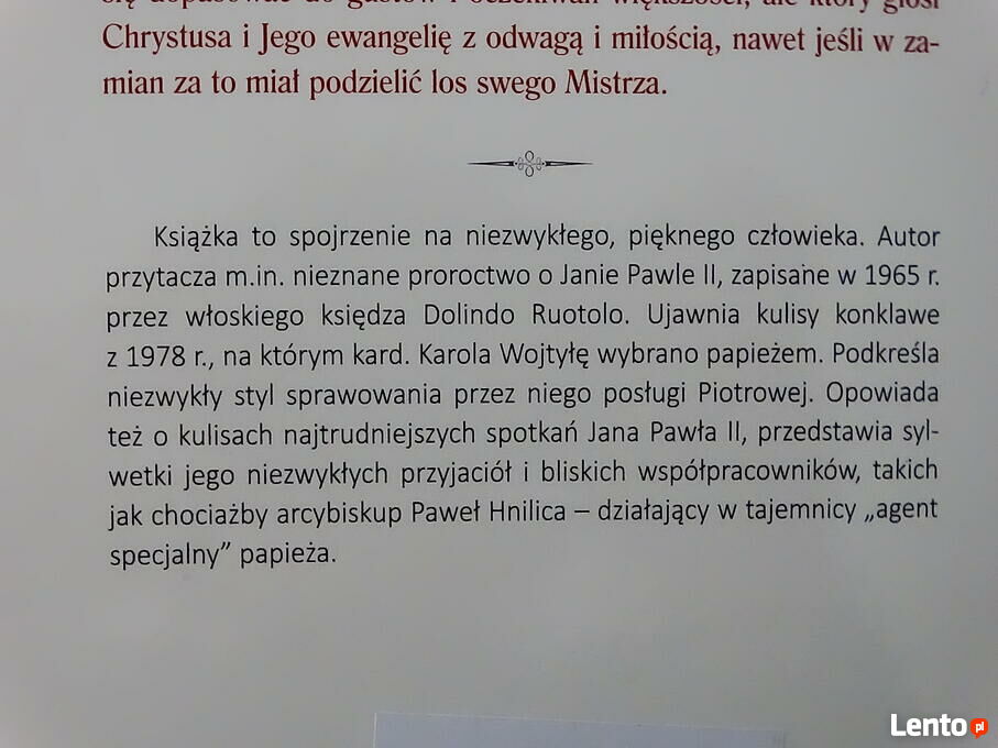 Książka to spojrzenie na niezwykłego, pięknego człowieka. Autor przytacza m.in. nieznane proroctwo o Janie Pawle II, zapisane w 1965 r. przez słynnego włoskiego księdza Dolindo Ruotolo. Ujawnia kulisy konklawe z 1978 r., na którym kard. Karola Wojtyłę wybrano papieżem. Opowiada też o kulisach najtrudniejszych spotkań Jana Pawła II, przedstawia sylwetki jego przyjaciół i współpracowników, takich jak chociażby abp Paweł Hnilica - działający w tajemnicy „agent specjalny" papieża.