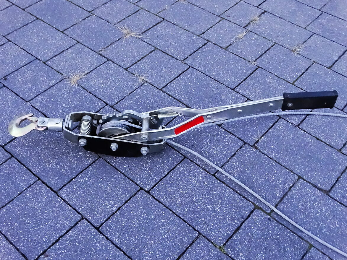Narzędzie działa na zasadzie mechanicznego przełożenia siły — użytkownik porusza dźwignią, która stopniowo nawija linę i przesuwa ładunek