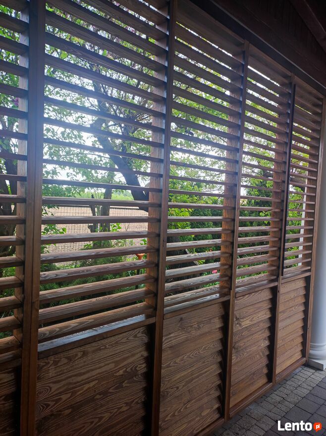 Sprzedam żaluzje regulowane, drewniane.Ruchome żaluzje są to drewniane deseczki, które mogą zmienić swój kąt nachylenia. Idealne na taras, balkon czy do altanki.