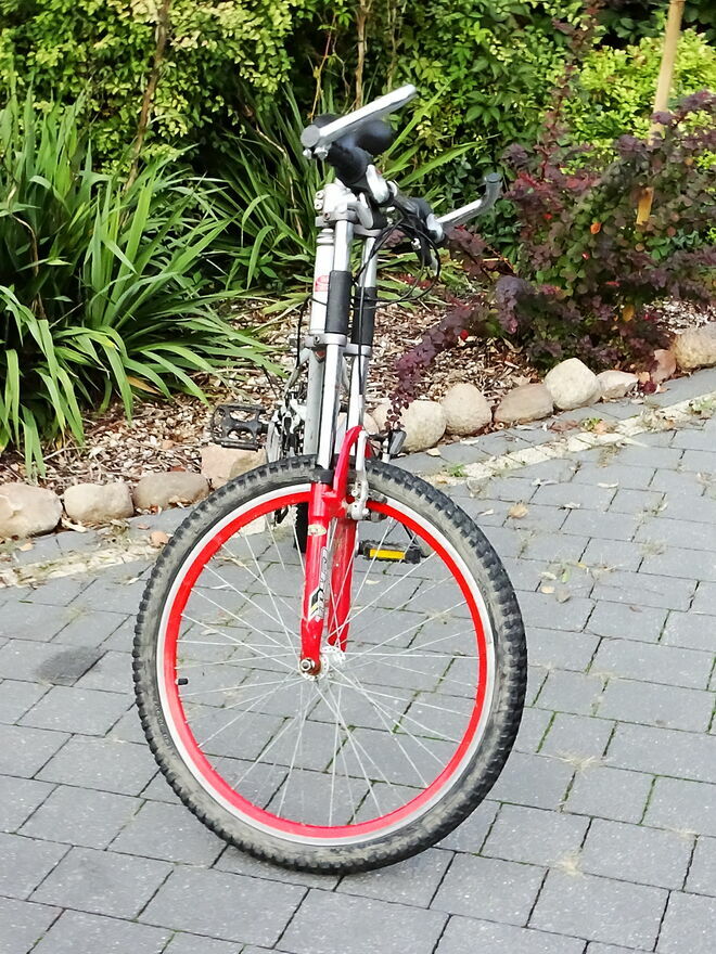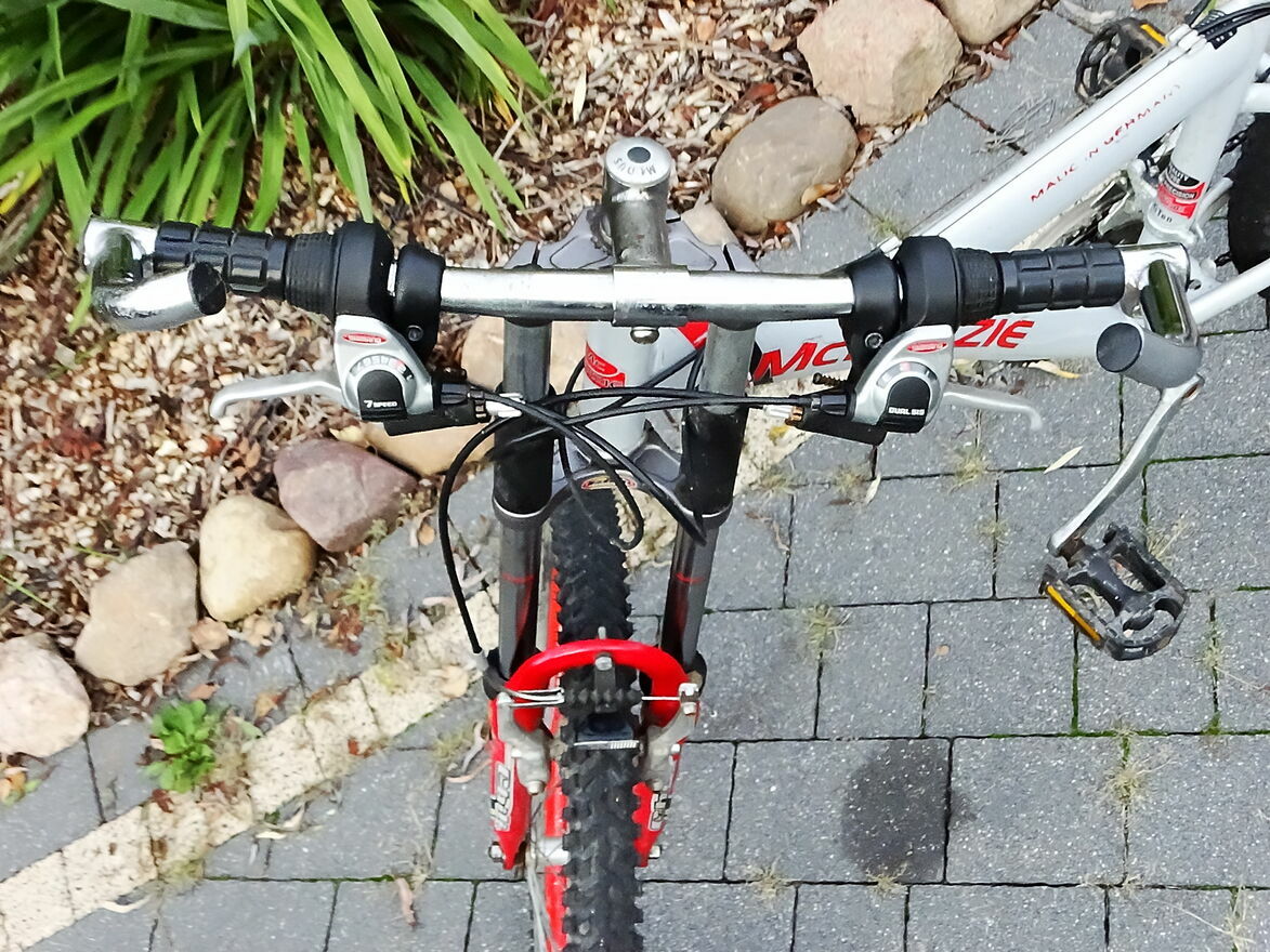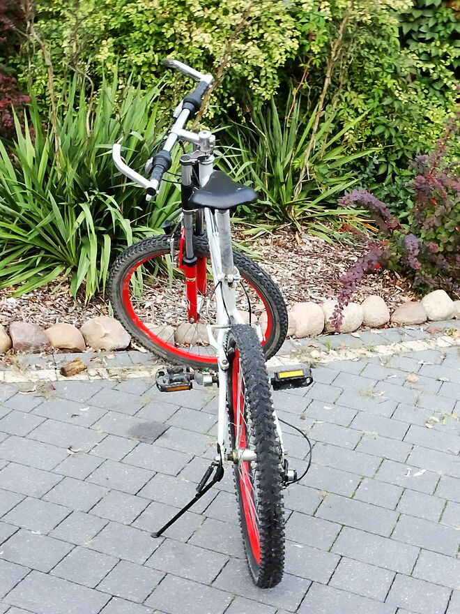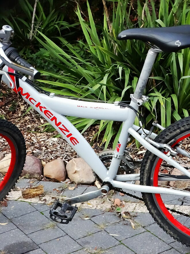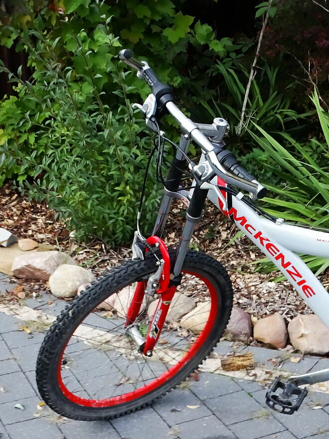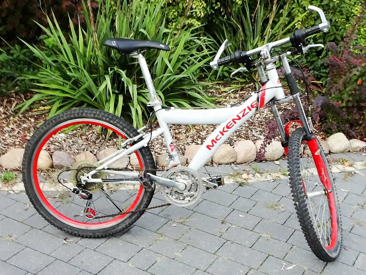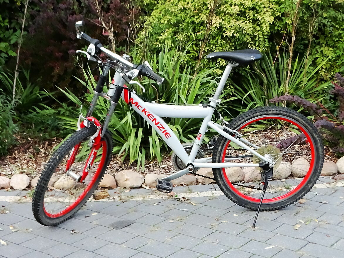 Rower górski marki MCKENZIE, z charakterystyczną srebrno-czerwoną ramą, czerwonymi obręczami i oponami terenowymi. To typowy MTB (Mountain Bike), zaprojektowany do jazdy po nierównym terenie, lasach, drogach szutrowych i miejskich przeszkodach. Oto pełne zestawienie:
