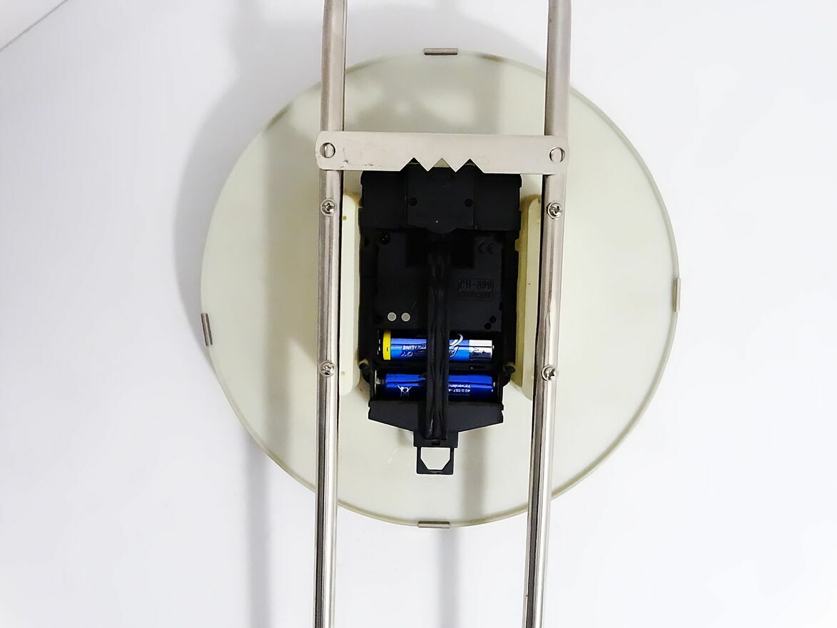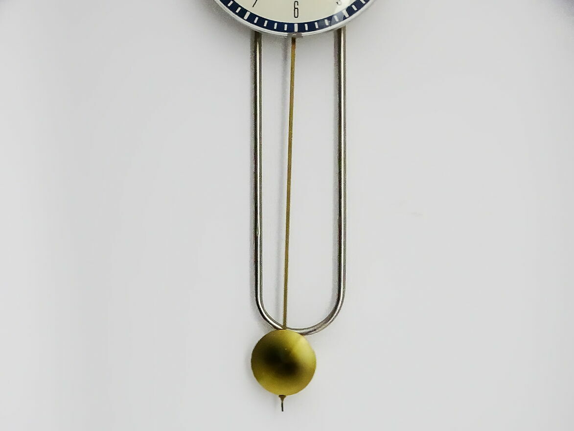 Kwarcowy zegar ścienny z wahadłem dekoracyjnym, produkowany w latach 70.–90. XX wieku.