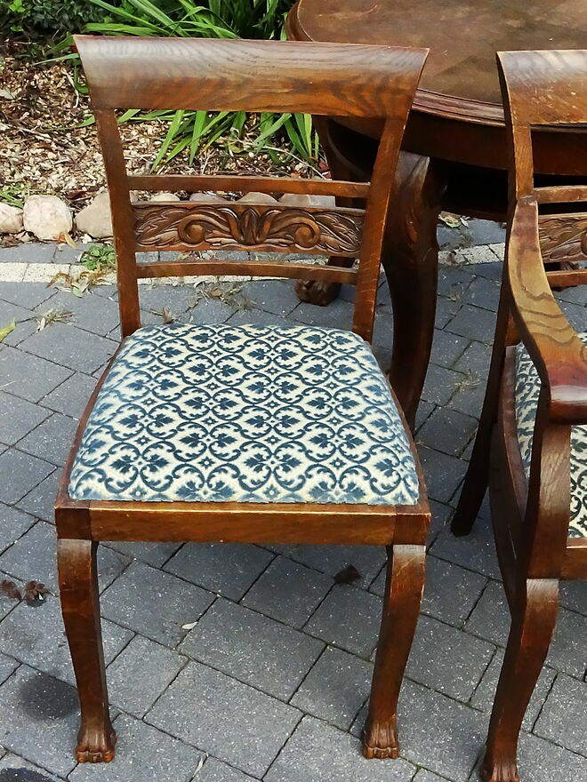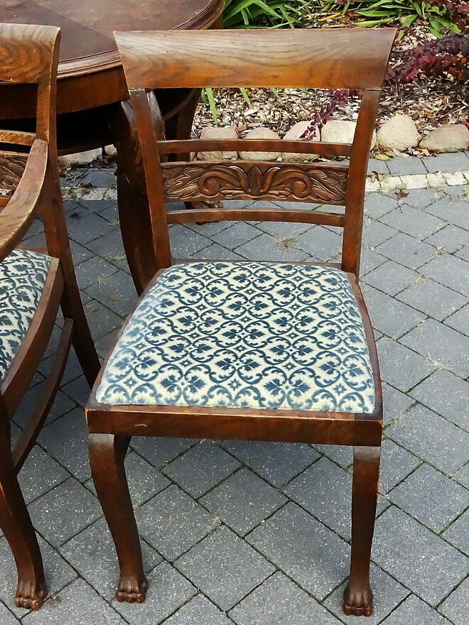 3 krzesła – drewno, tapicerowane siedziska (jasnoniebieski wzór geometryczny)
