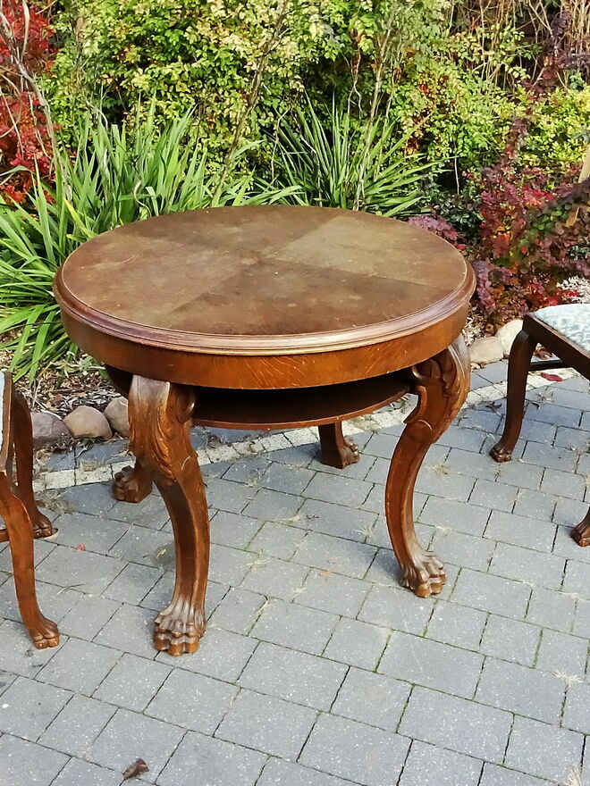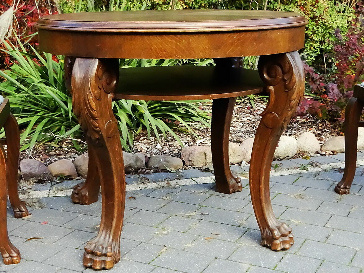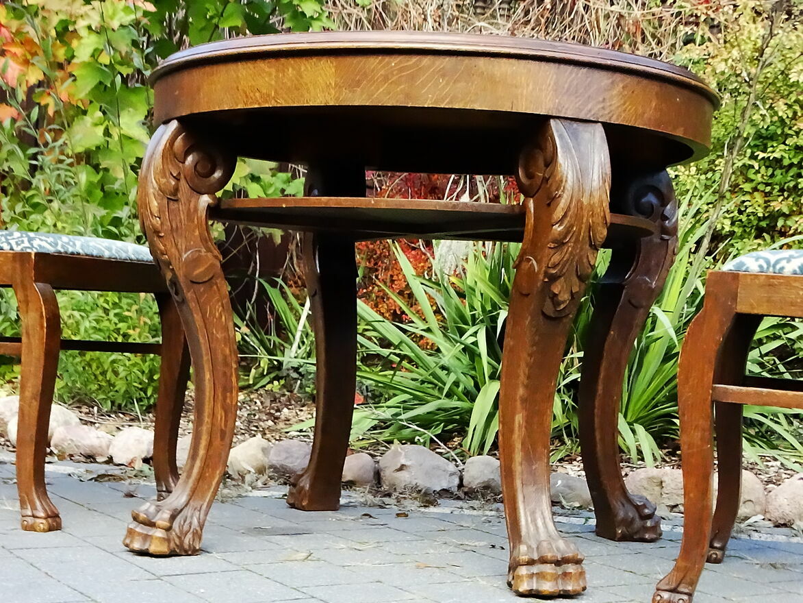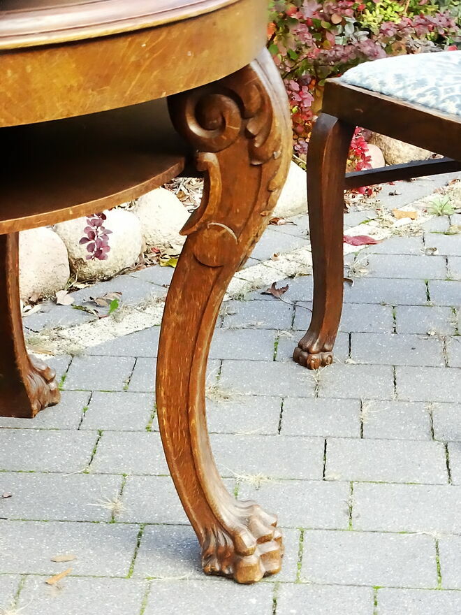 Stół okrągły – drewno lite, rzeźbione nogi, lakierowana powierzchnia